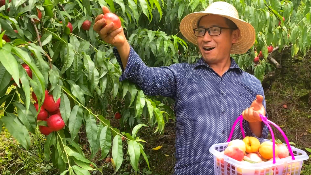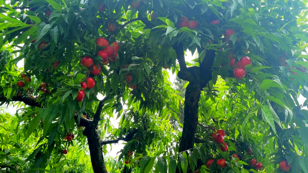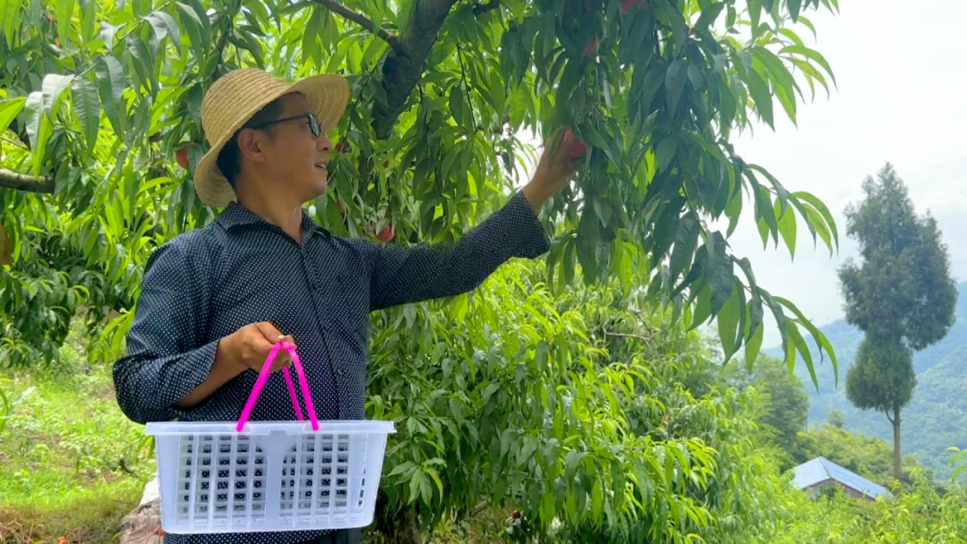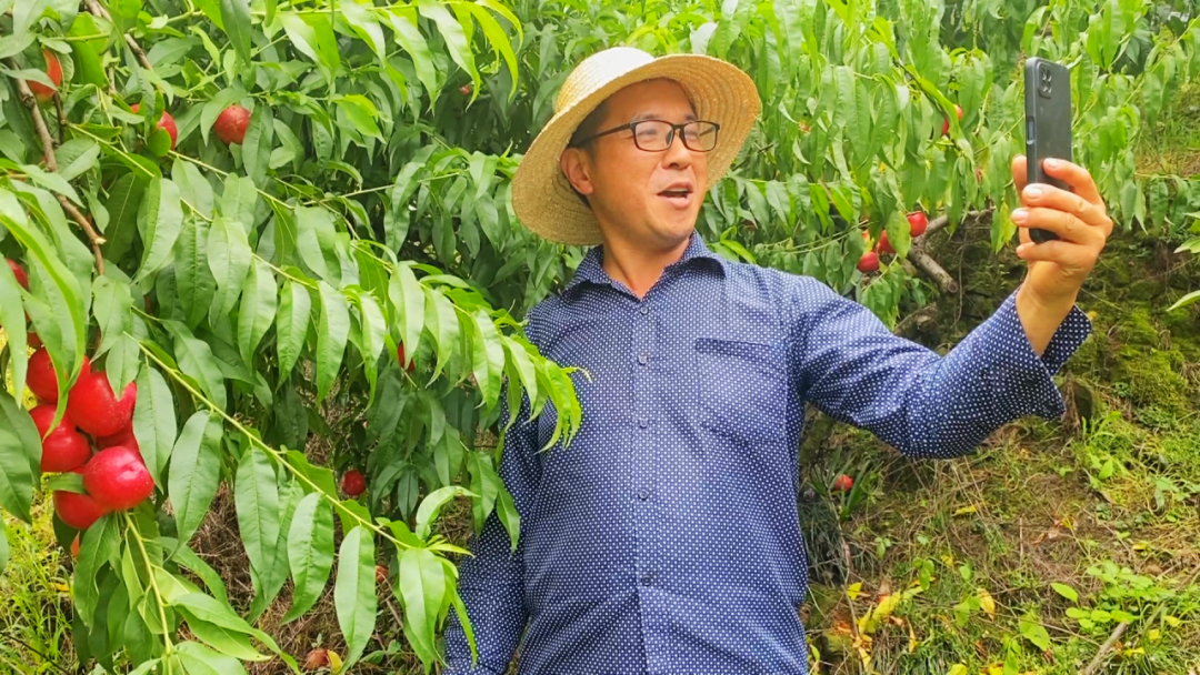 6月5日,记者走进兴山县花果飘香家庭农场的桃园里,一颗颗成熟的桃子挂满枝头,果香四溢,品相好、口感佳,在十里八乡远近闻名。农场负责人王远兴正在拍摄小视频,只见他随手从树上摘下一颗桃,咬上一口,鲜嫩多汁。