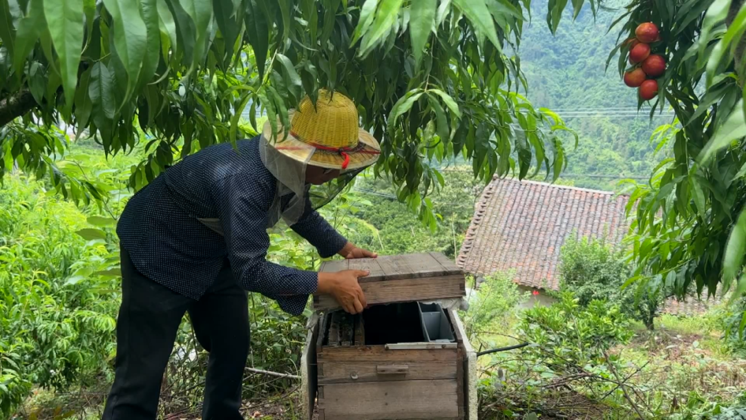 为了保证桃子的质量和产量,王远兴还钻研“树上优质果、树下土蜂蜜”的立体种养模式。桃林成为蜜蜂的乐园,桃树花粉增加蜂蜜产量。经由蜜蜂授粉的果树,结果率更高,桃子口感更加香甜。