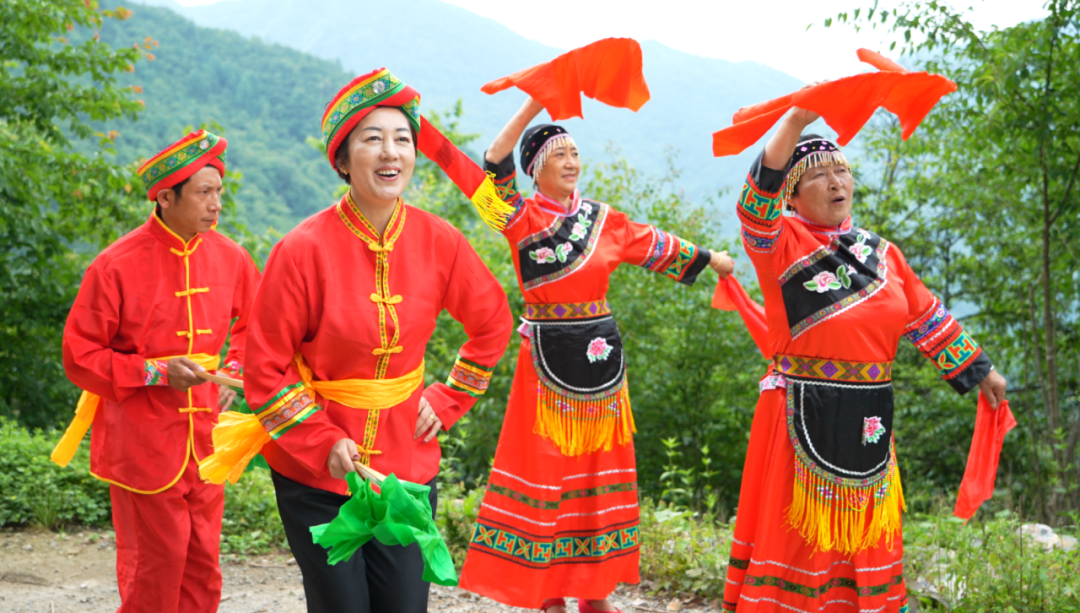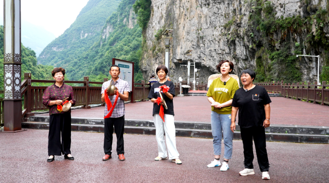 “二十大报告来强调,坚持党的好领导,人类和平与发展,团结奋斗共缔造......”6月27日,在南阳河国家水利风景区“一线天”,一场非遗地花鼓表演正在精彩上演,清脆的锣鼓声与嘹亮的歌声在青山绿水间阵阵回响,进出神农架的车辆鸣笛声似乎也在伴唱。