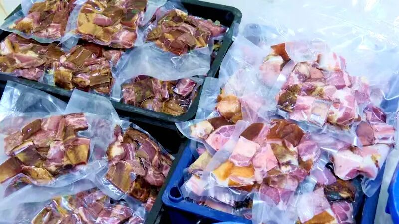 7月23日,在黄粮镇水磨溪村村委会,只见这里的工作人员正将刚刚熏制好的腊肉切块、称重、包装、抽空,准备包装后送到宜昌客户手中。不一会儿,打包好的一块块腊肉色泽光润、肥瘦分明,香气浓郁,令人垂涎欲滴。
