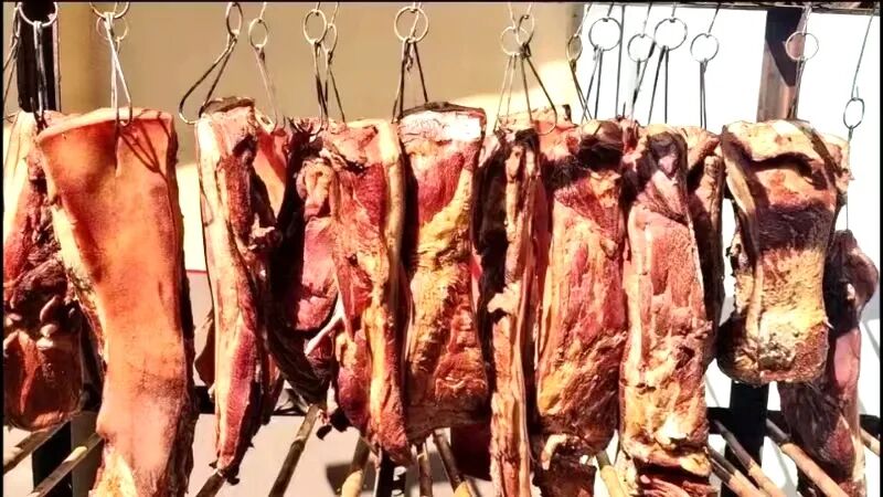 据了解,水磨溪村夏季熏制的腊肉均是采购本地农户散养的纯粮食土猪,现杀鲜肉抹盐腌制,再通过传统工艺焚烧柏树枝烟熏而成。从今年6月初开始,经过四十多天熏烤,腊肉既保留了土猪肉的鲜香,又带着木制烟火气,香气四溢,风味绝佳。