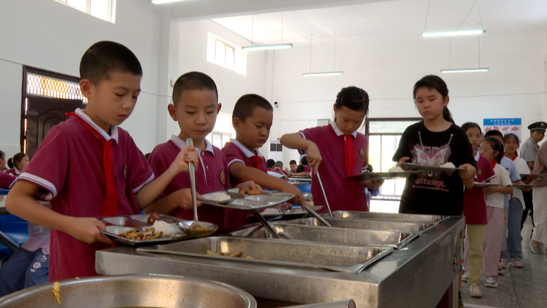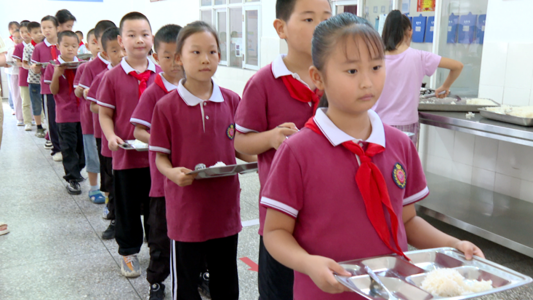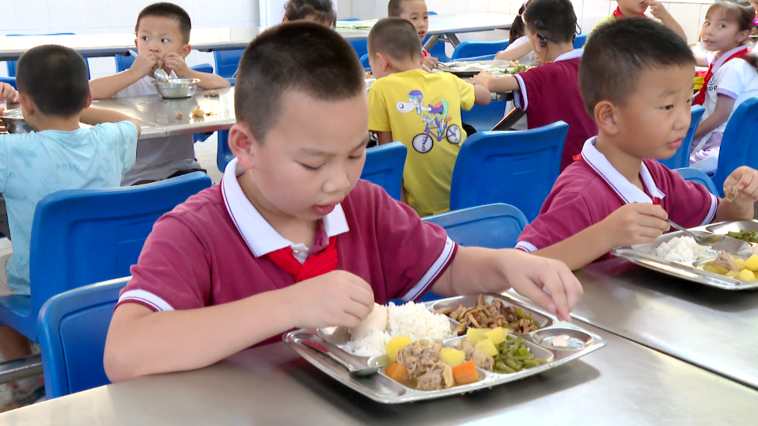 9月5日中午12点,南阳镇中心小学的食堂准时开餐,清炒白菜、炒豇豆、蘑菇炒肉、土豆炖鸡、番茄鸡蛋汤,美味可口的菜肴被盛放在熟食保温台上。同学们洗干净手,排队打餐,有序落座,专心致志地品尝美食,脸上洋溢着幸福和满足。