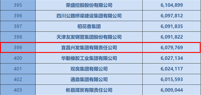 其中,宜昌兴发集团有限责任公司以营收607.97亿元上榜,位居第399位。