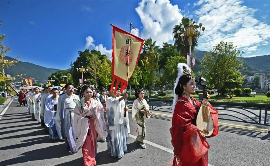 湖北省宜昌市兴山县是中华民族团结和平使者王昭君的故乡,农历八月十五是王昭君的诞辰。在中秋佳节即将来临之际,来自兴山社会各界的汉服爱好者,衣着华丽,手持道具,在香溪河畔巡游、展演,举手投足间尽显中华传统文化之美,一颦一笑彰显了“昭君故里、和美兴山”的“和合”精神内涵。