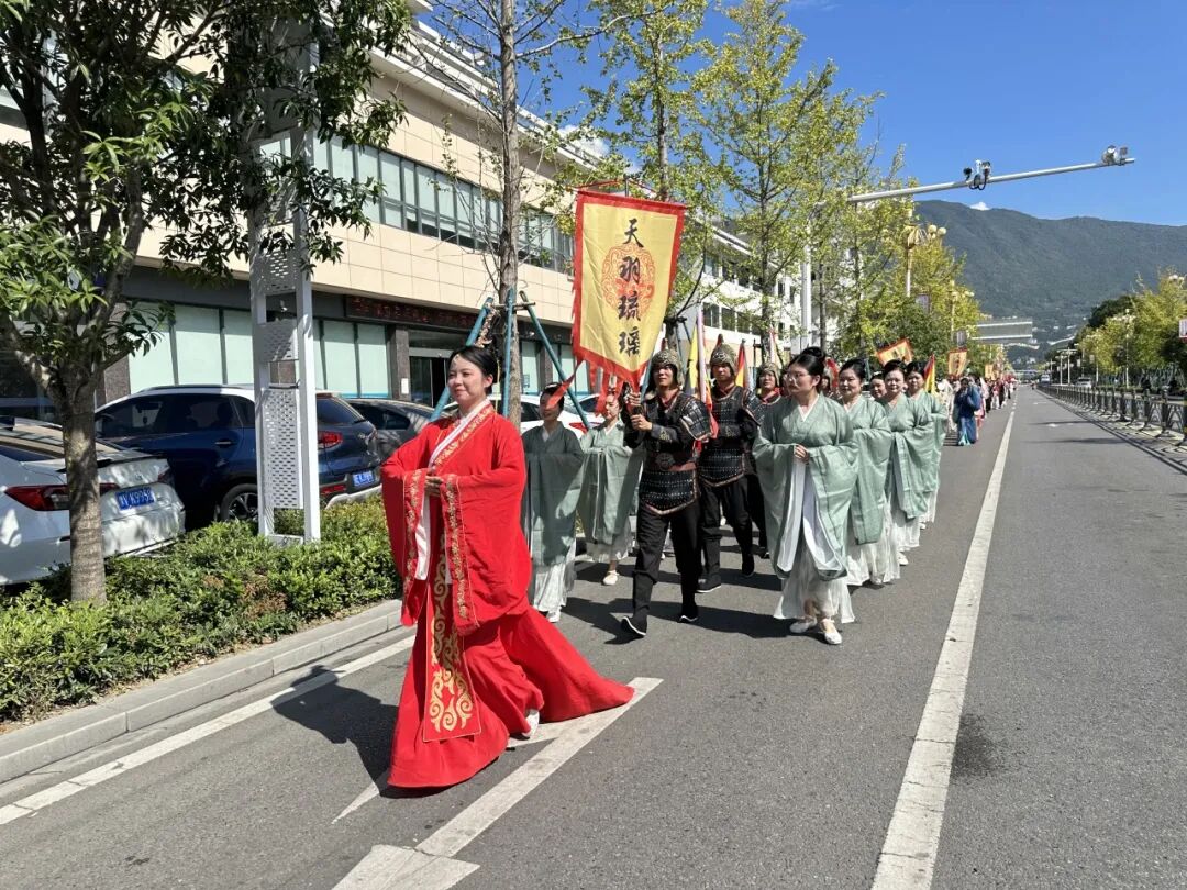 随着18名领队昭君精彩亮相,巡游队伍正式出发。一路上,浩浩荡荡,犹如一条绚丽的彩带在城市中舞动。每个方阵都由一位独具特色的“昭君”领头,她们或半抱琵琶,或手持纸扇,在妆造和道具上各有千秋,仿佛诉说着昭君不同的人生阶段。还有14支兴山民俗展演队伍,涵盖地花鼓、九子鞭、采莲船、渔鼓等各类兴山民俗。