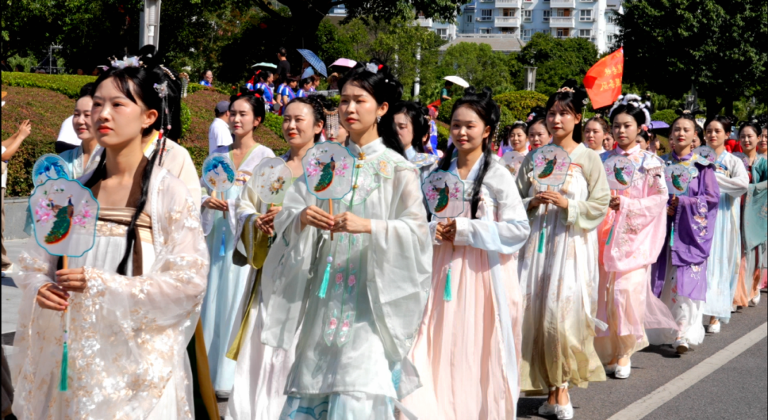 9月13日上午时分,3辆花车、18支汉服巡游队伍和14支民俗展演队伍在昭君广场整装待发。香溪河畔,衣袂飘飘的少男少女身着汉服,手持团扇或宫灯,18位风采各异的“昭君姑娘”,在典雅的古乐声中缓缓走出,有的端庄典雅,有的灵动飘逸,有的皎洁脱俗,恍若千年前的昭君与乡亲迎面而来。