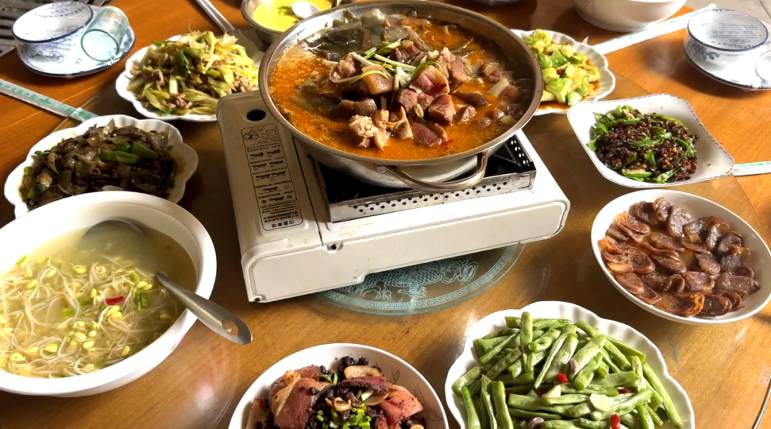 “红色岩庐”餐厅以“土”见长,着力让“农家饭”占主导地位。言谈间,本地厨嫂采用本地的洋芋果炖猪蹄、板栗烧土鸡、榨广椒炒腊肉、盐菜扣肉、懒豆腐(合渣)、南瓜泥、土豆片、妙白菜等五颜六色的菜肴摆满一桌,食客们吃得有滋有味,酣畅淋漓。