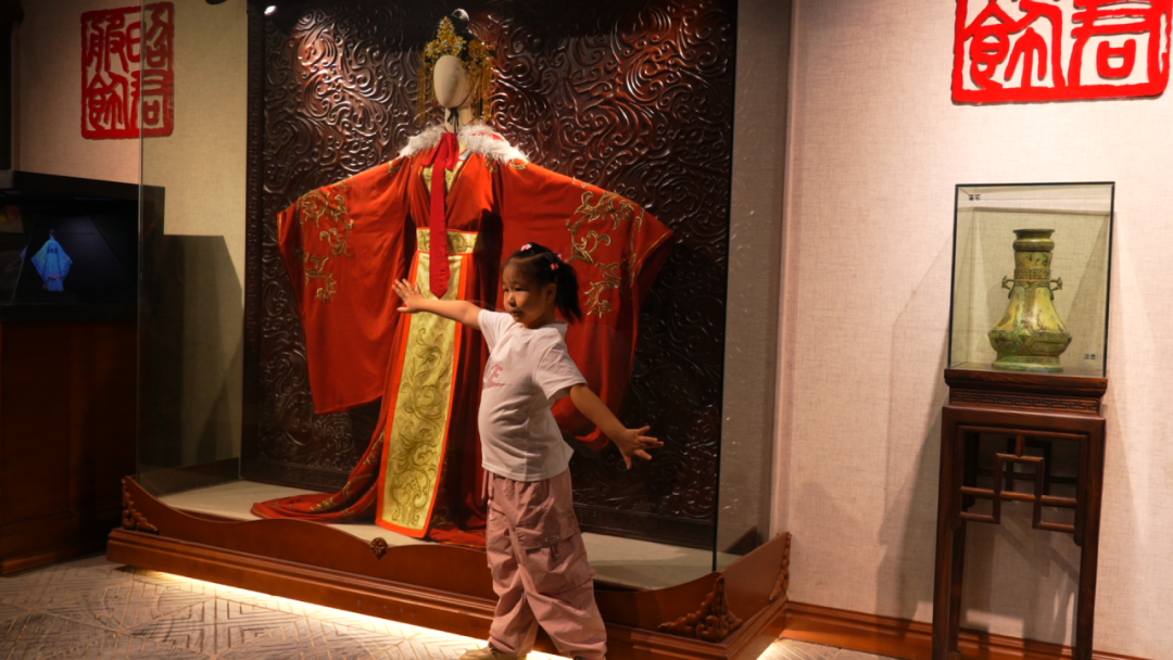 国庆假期,昭君村景区每天都进行《昭君》情景剧演出。台上的“昭君”时而活泼明快,时而郁郁寡欢,时而坚毅果敢。台下的观众们仿佛穿越时空,与“昭君”一同经历了那段波澜壮阔的历史。来自武汉的游客张琦特地与孩子穿上汉服,徜徉在古香古色的建筑中,沉浸式体验昭君文化。
