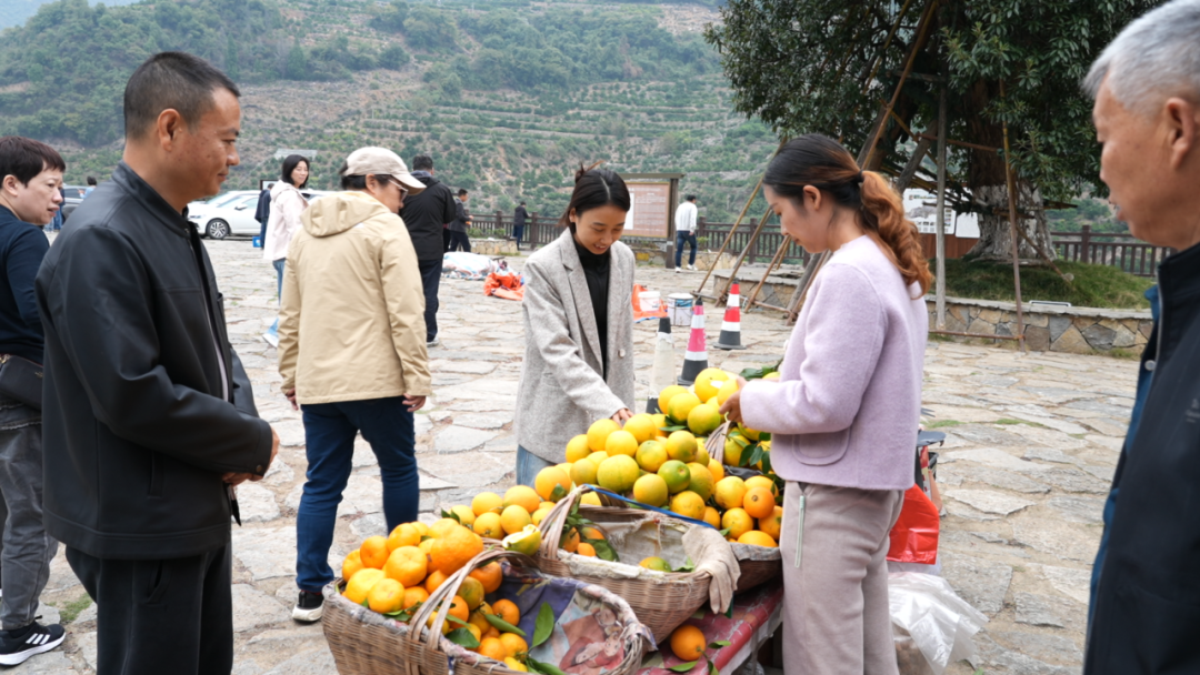 在水上公路一侧的山坡上,建有观景平台,来自全国各地的游客在此驻足观景。近日,脐橙、砂糖橘、果冻橙等水果丰收,古夫镇深渡河村村民闵耀奎的脐橙园就在公路旁的田间,他和邻居们将收获的柑橘卖给游客,柑橘也搭上了旅游“顺风车”。
