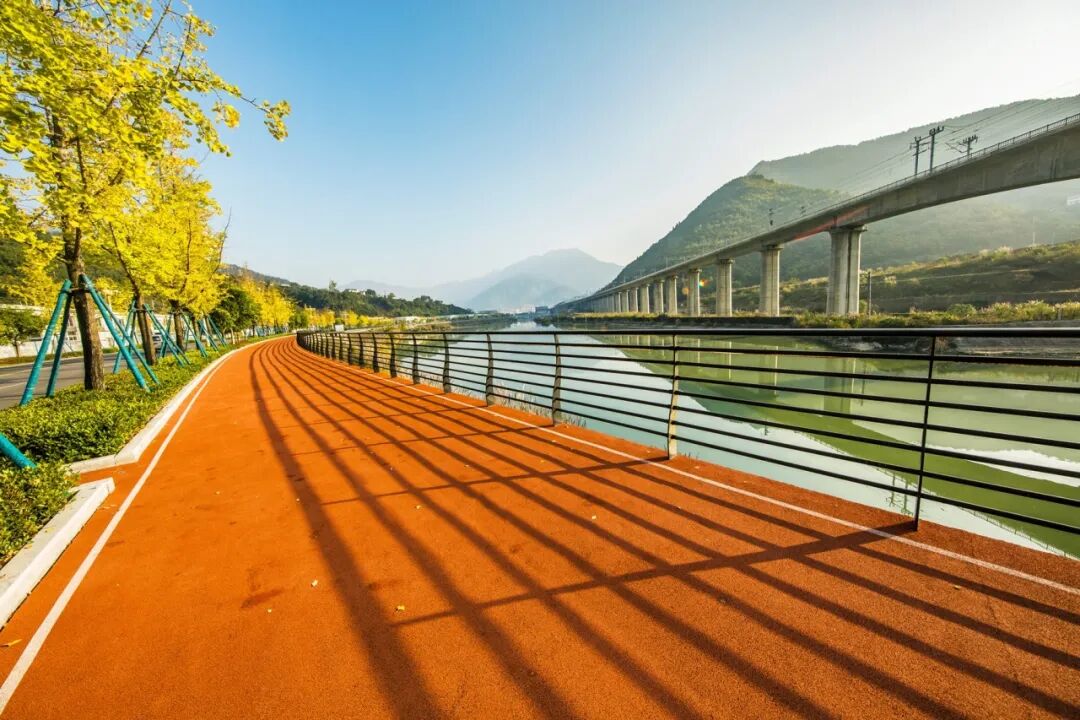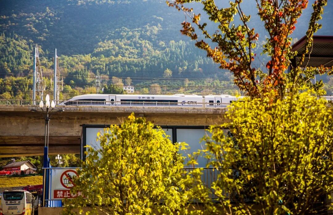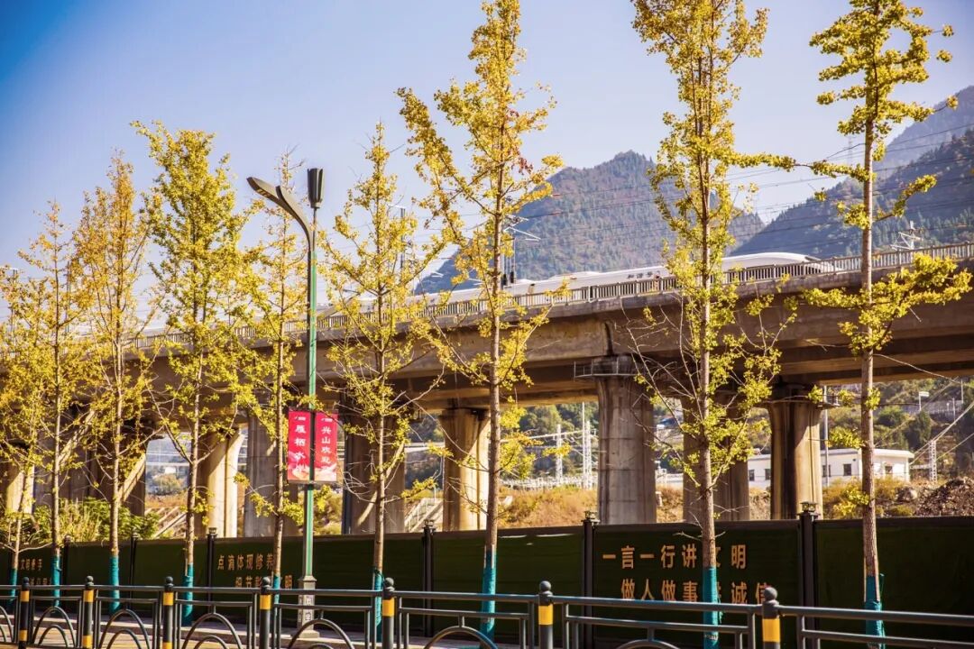 在香溪河畔,仰望被金色阳光包裹的银杏枝叶,高铁飞驰而过,共同勾勒出一幅美丽兴山的新画卷。