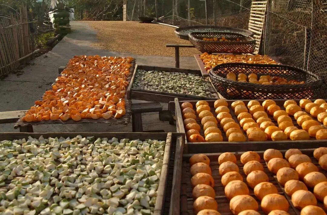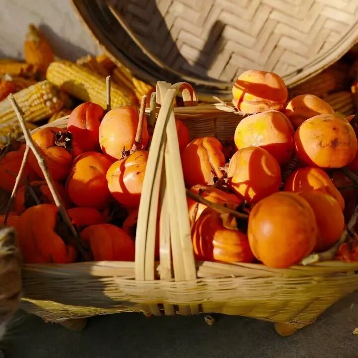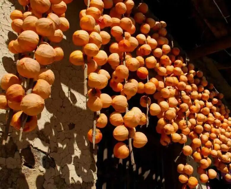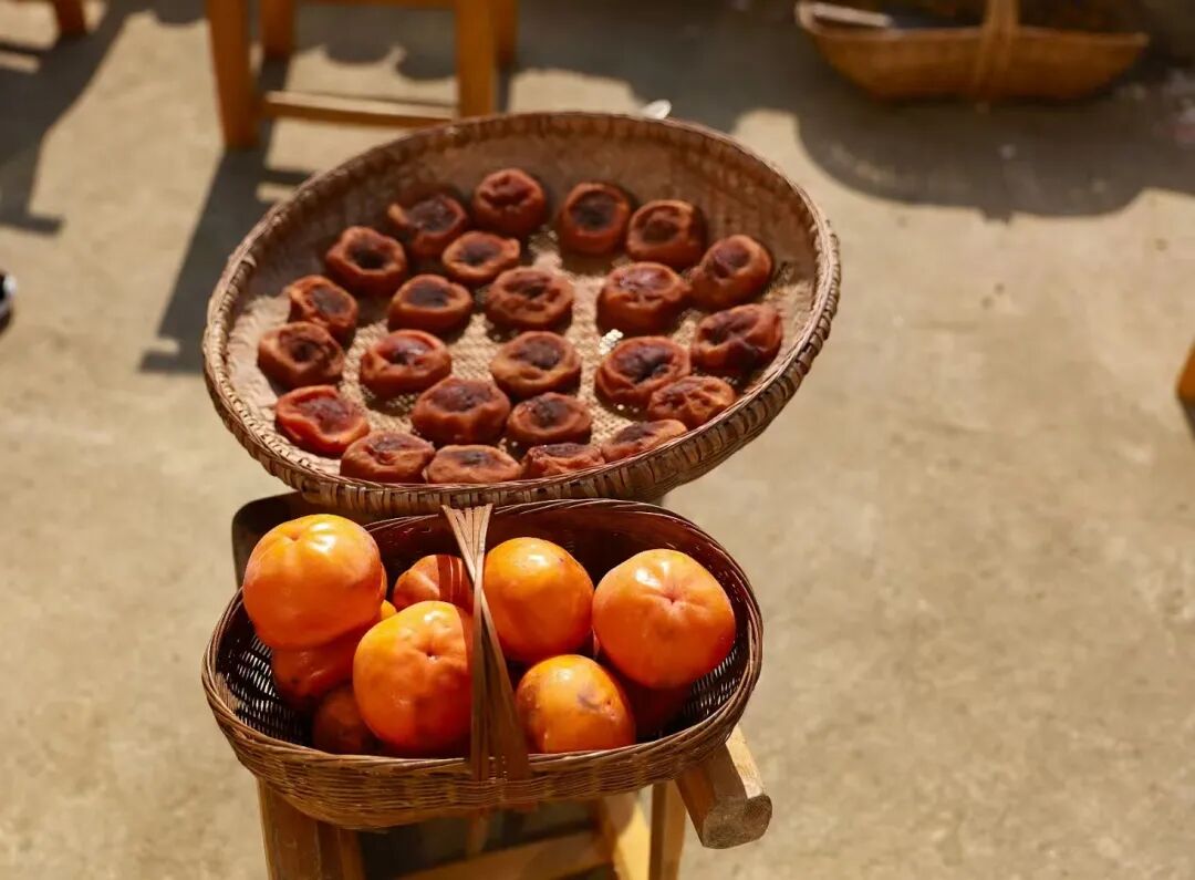 村里许多人家把摘下的柿子削了皮,成群成群地放在大竹篾上晾晒。经历过阳光和时间的滋养,变成了香甜可口的柿饼。柿子清甜馨香,细细品味,就能尝到一阵甘甜,一阵清爽。