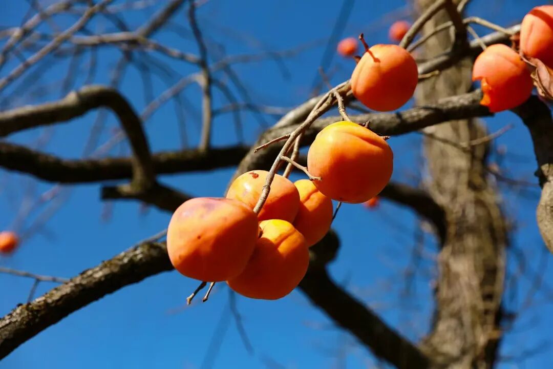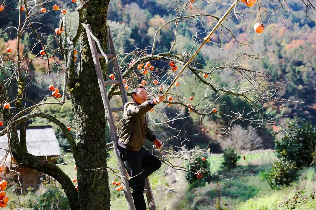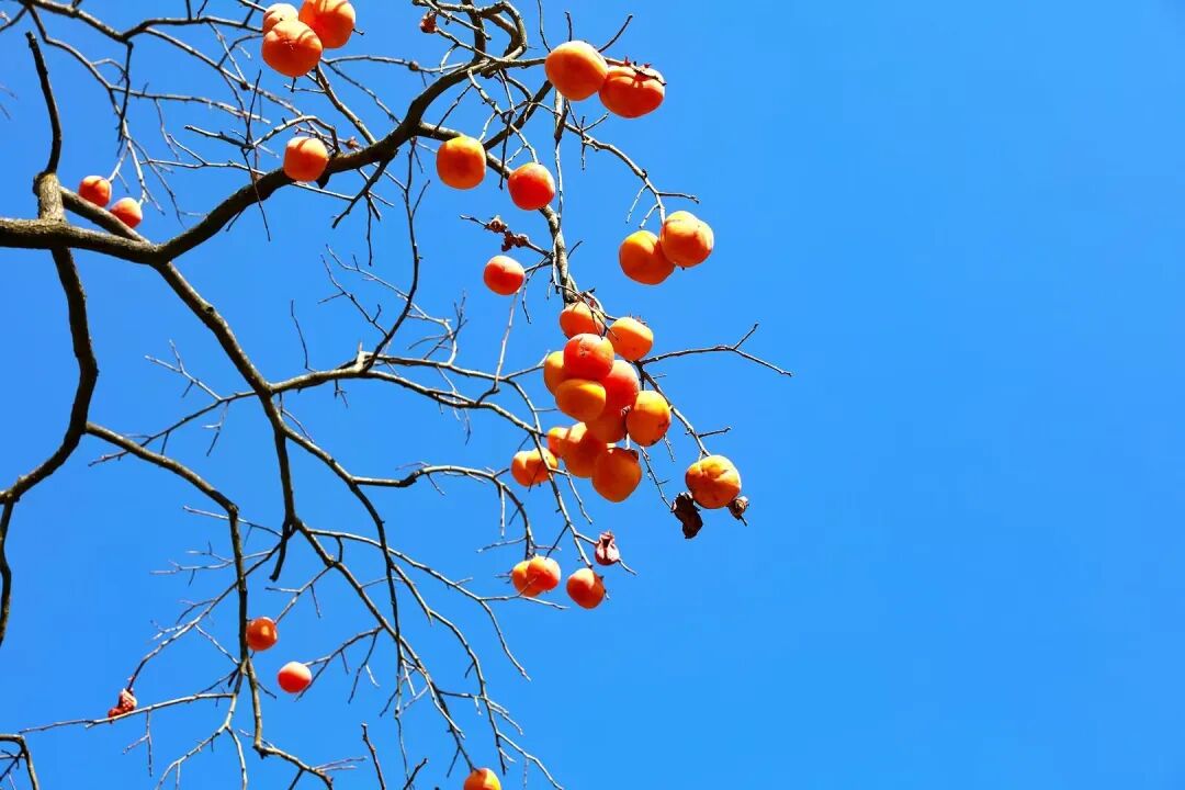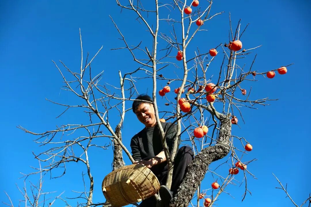万物将休,唯有柿子肥繁,凭借金风挂上枝头。远远望去,像一盏盏小红灯笼。一个个柿子表皮色泽鲜亮,在阳光的照耀下,从里到外都透着香甜气息。果农们爬上柿子树,将成熟的柿子采摘装筐,脸上洋溢着丰收的喜悦。