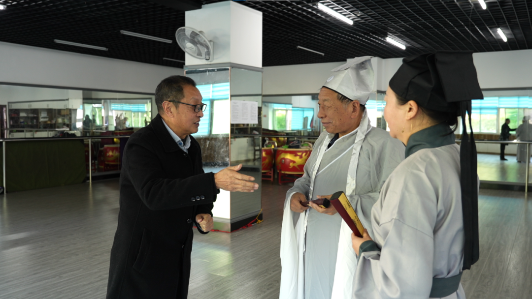近日,在县文化馆的排练厅内,张代久和踩堂戏的表演者正详细沟通《梁山伯与祝英台》的演绎细节。看着两位表演艺术家生动地演绎出剧目的精髓,站在一旁的张代久也是连连称赞。