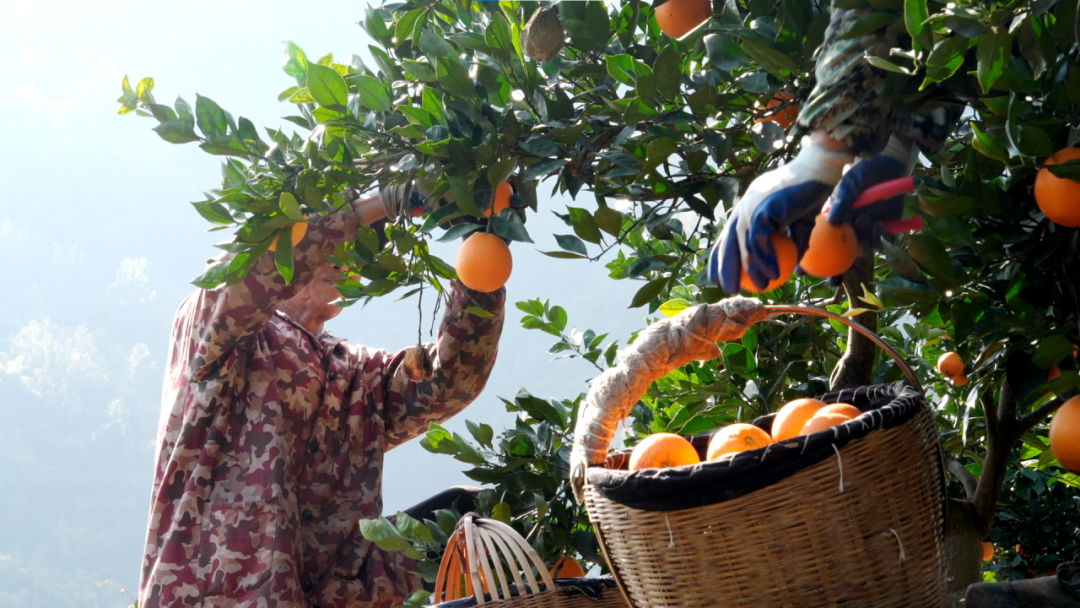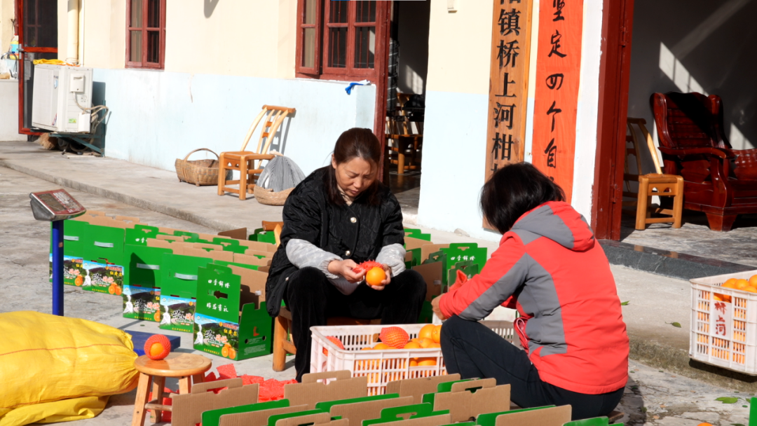 冬阳暖照,微风轻拂,斑驳的光影透过叶间缝隙,洒在一颗颗黄澄澄的脐橙上。村民们在昭君镇大礼村的一处柑橘园里往来穿梭,双手在枝叶间采摘果实,不一会儿,便装满了一箩筐。随后,一筐筐脐橙被稳稳地搬运至一旁,整齐地堆放在合作社门前的空地上。村民们围坐在一起,精心分拣,将脐橙装盒、过秤、封盒,动作一气呵成。