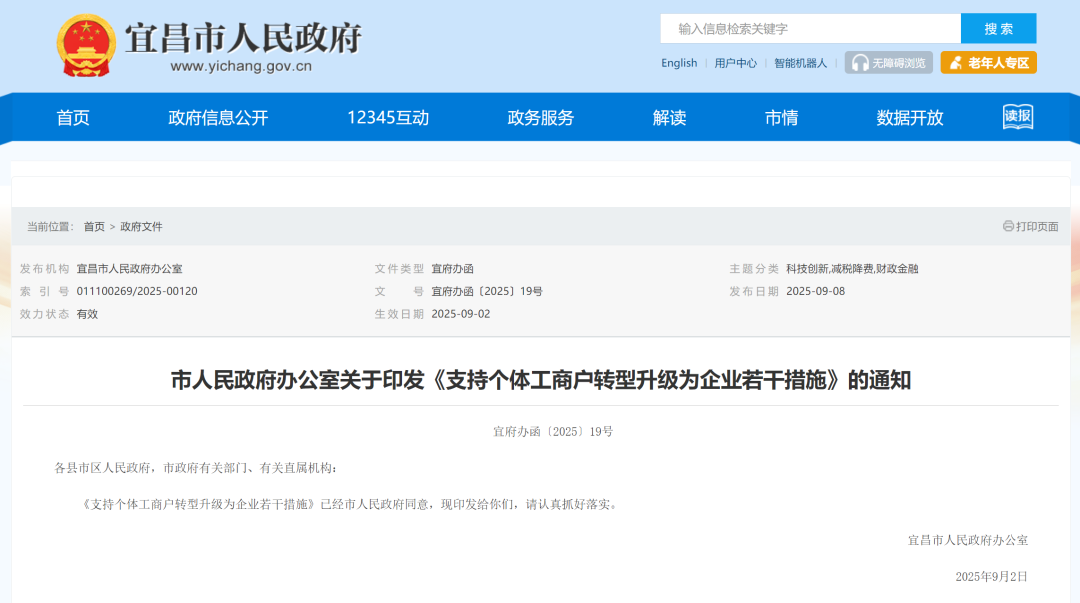 近日,宜昌市人民政府网站发布宜昌市人民政府办公室关于印发《支持个体工商户转型升级为企业若干措施》的通知。