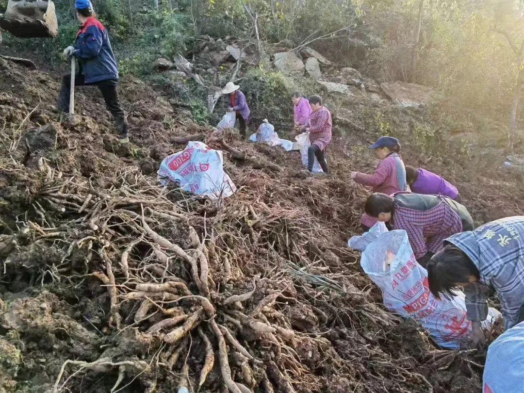 “轰轰……”,雪过天晴后,兴山黄粮镇水磨溪村500多亩的百部种植基地一片繁忙景象,该村书河种植专业合作社负责人袁书河在现场指挥挖机、工人们正在采收百部。