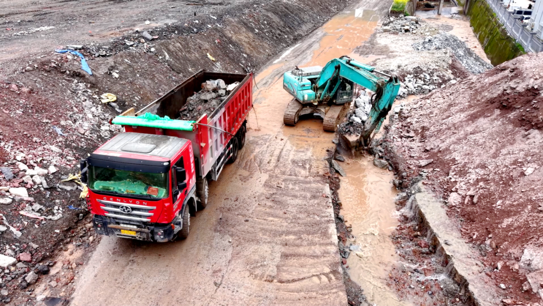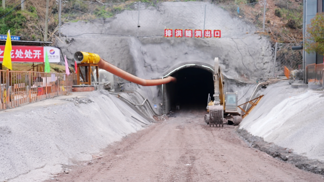 在场坪施工现场的另一侧,配套排洪隧洞的建设同样如火如荼。记者在出口一侧的施工现场看到,工人们正全力以赴在隧洞内施工,有序推进掘进工作。据了解,这条排洪隧洞进口在王家河,出口在兴发商混站办公楼旁,建成后,该地段五童河的流水将通过隧洞流入南阳河,为项目安全建设及周边区域防洪提供有力保障。