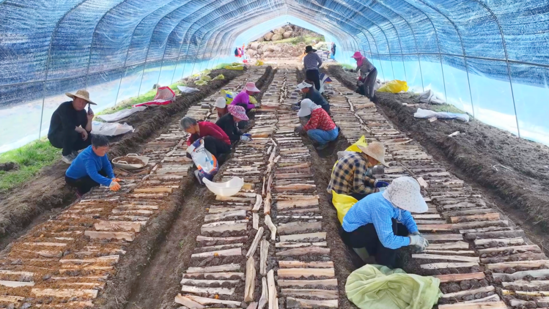 春回大地,春耕正忙。4月10日,水月寺镇晒谷坪村的大棚基地里,一派热火朝天的劳作景象。30多位村民分工协作,起垄、摆菌种、放木材、撒腐殖土、播种子,每一步操作都有条不紊、默契十足。