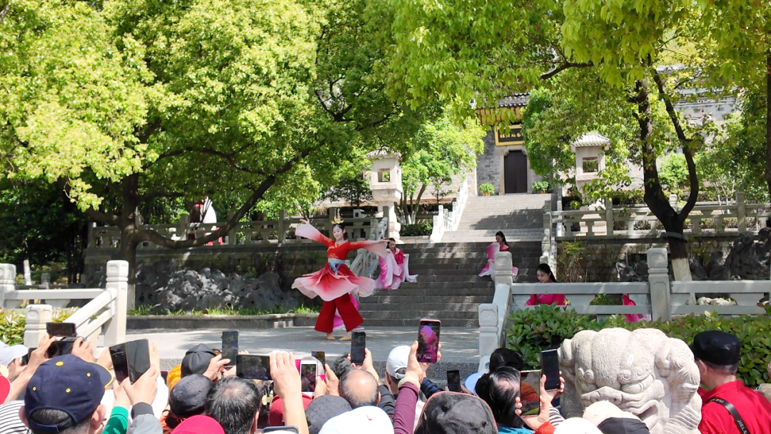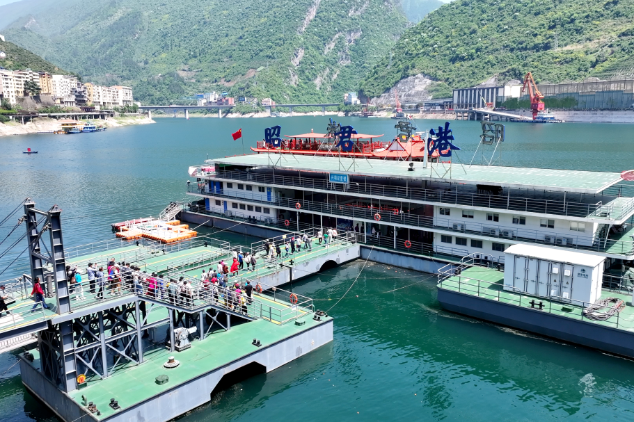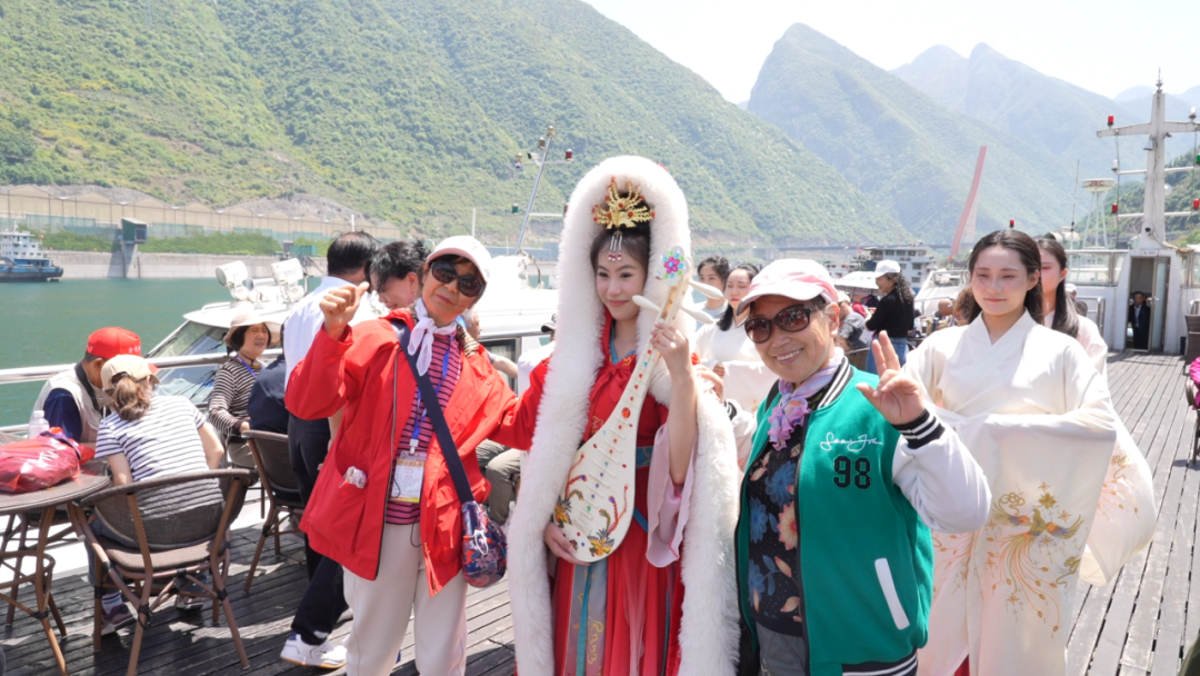 告别昭君村的人文底蕴,旅行团前往峡口旅游码头,准备开启高峡平湖游船之旅。码头边,昭君艺术团的青年演员们身着典雅汉服,手持团扇,在游船入口处热情欢送游客,汉服翩跹与春日暖阳相映成趣,营造出浓郁的文化氛围。